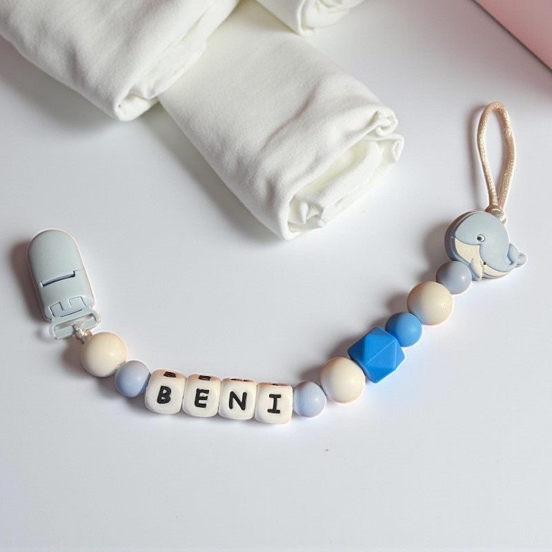 A kék bálnás egyedi neves cumilánc megakadályozza, hogy a cumi földre essen. BPA-mentes szilikon gyöngyökkel, biztonságos és személyre szabható.