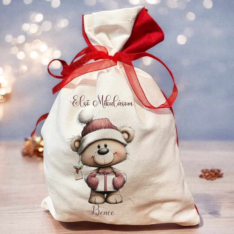 Egyedi névvel kérhető, fehér színű mikulászsák barna maci mintával és piros szatén szalaggal. Mérete: 20×30 cm – tökéletes édességeknek és kisebb ajándékoknak.