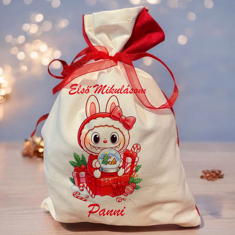 Egyedi, névre szóló mikulászsák fehér színben, piros szatén szalaggal. Praktikus és személyes megoldás édességek és apró ajándékok átadásához.